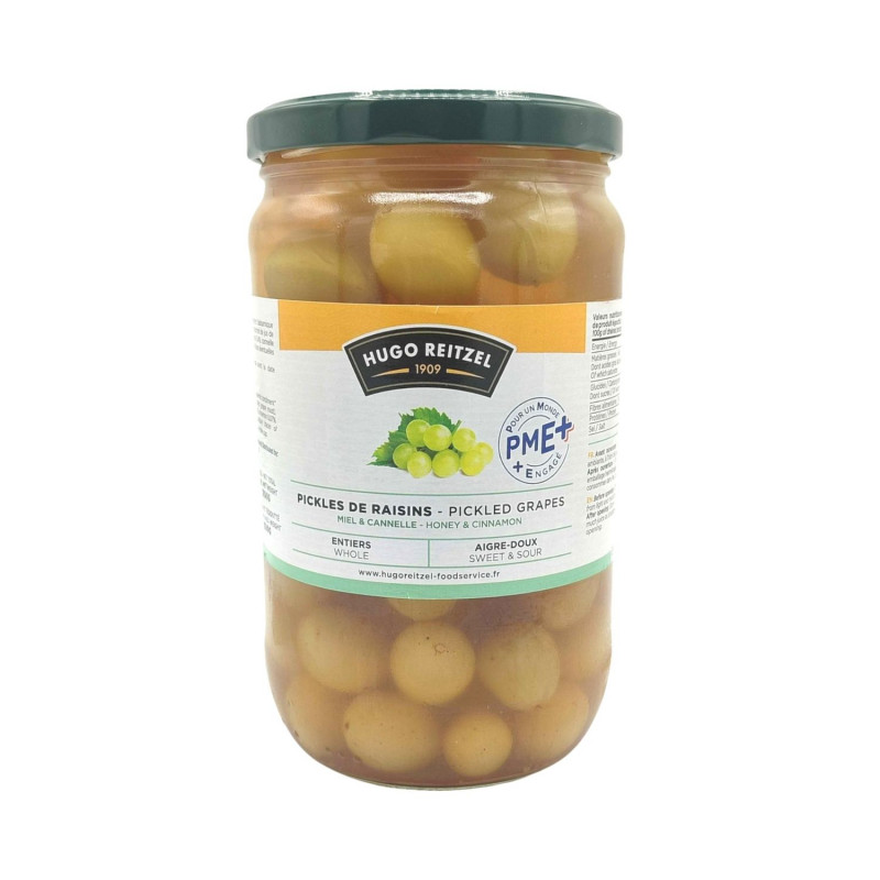Ajoutez une touche sucrée et acidulée à vos plats avec nos pickles de raisin. Ces raisins entiers sont marinés dans un mélange de miel et de cannelle, qui équilibre parfaitement le sucré du raisin et l'acidité du vinaigre, créant un condiment unique qui ravira vos papilles. Parfaits pour accompagner vos viandes, salades, fromages ou pour apporter une note originale à vos plats, les pickles de raisin sont une façon gourmande d'introduire des saveurs nouvelles dans votre cuisine.