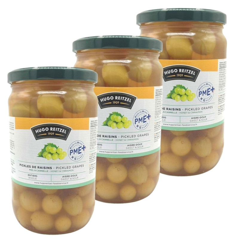 Ajoutez une touche sucrée et acidulée à vos plats avec nos pickles de raisin. Ces raisins entiers sont marinés dans un mélange de miel et de cannelle, qui équilibre parfaitement le sucré du raisin et l'acidité du vinaigre, créant un condiment unique qui ravira vos papilles. Parfaits pour accompagner vos viandes, salades, fromages ou pour apporter une note originale à vos plats, les pickles de raisin sont une façon gourmande d'introduire des saveurs nouvelles dans votre cuisine.